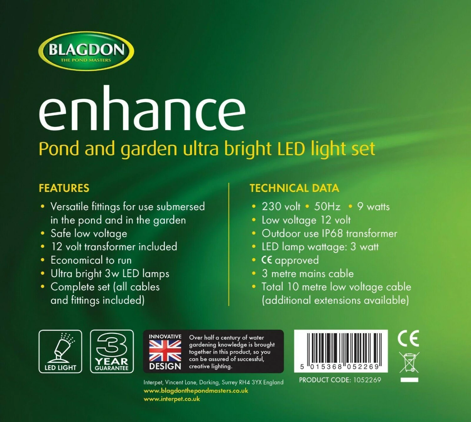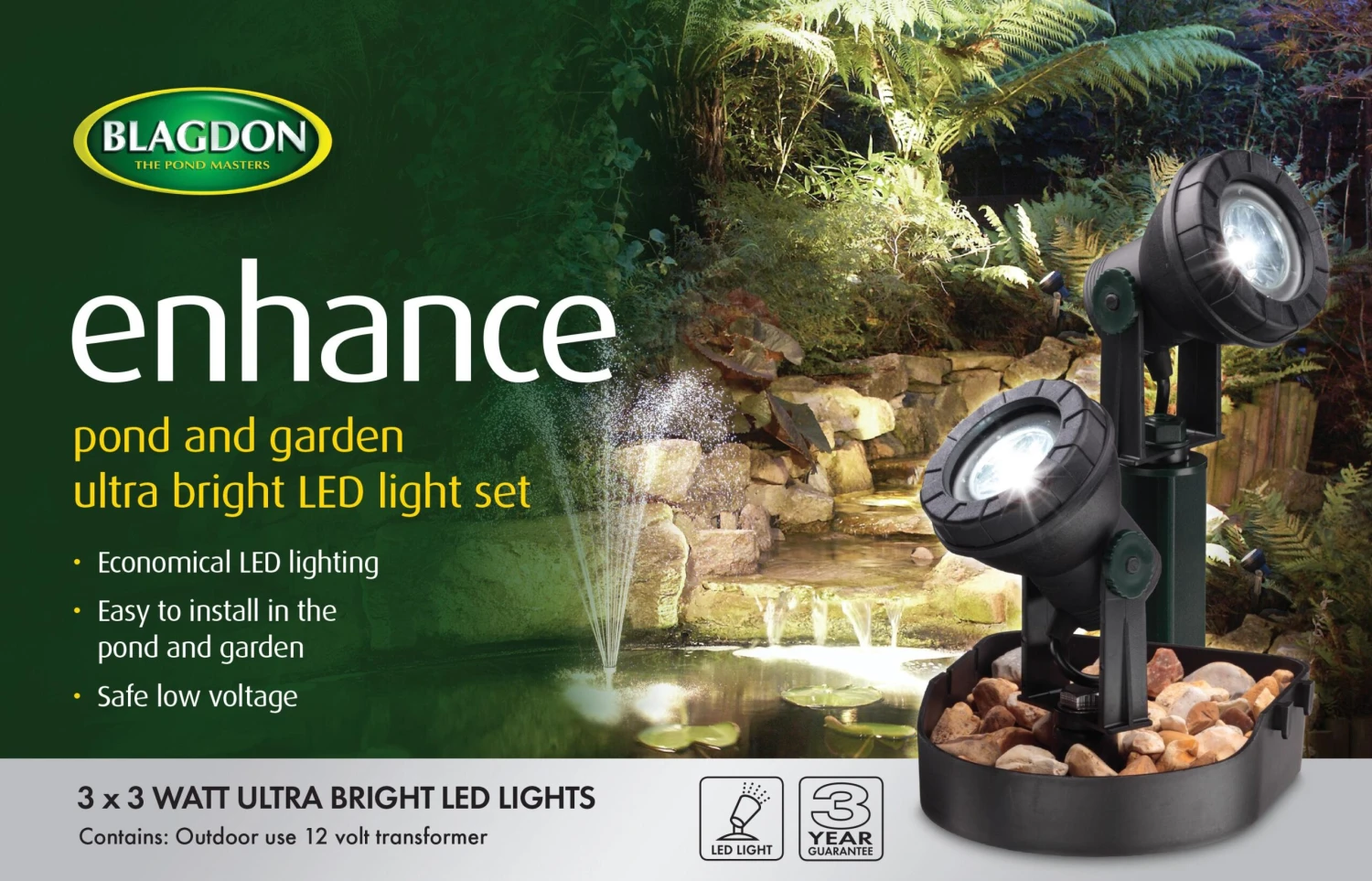 Blagdon 3 x 3 watt bright LED lights give multiple options being placed around borders, patios, paths or submerged in your pond. Low running cost & long lasting with LED technology. The lights come with 3 lenses (cyan, magenta & green). Safe and easy to install for outdoors.