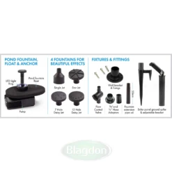 The Liberty Mains Free Pump with LED Lights is suitable for use in three different set-ups: In a pond as a fountain, using the float and anchor, and four different fountain features provided. It can also be used in a self-contained water feature; either bought or home-made, to create a fountain using the four heads provided. Or finally as a feature pump in something like a sink and tap set-up. Run by the long-lasting Lithium-ion battery and re-charged using the high powered solar panel, you’ll not need to add power to the garden and can locate your feature wherever you desire.Â