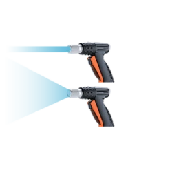 Claber’s metal jet spray gun is a nice tough piece of kit for all gardeners. With a comfort rubber grip and front on – of flow control adjustment. The water jet is adjusted by the knob at the rear, this is a very though spray gun made from quality plastics and metal parts with a rubber lined body for strength and impact resistance. The spray and water flow are fully adjustable from completely closed concentrated to completely open fan spray.